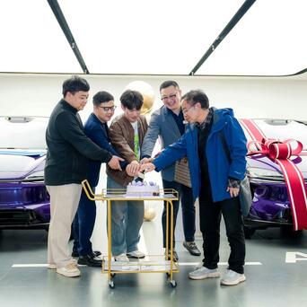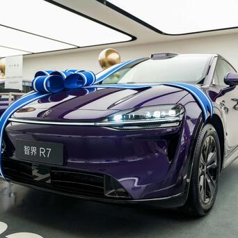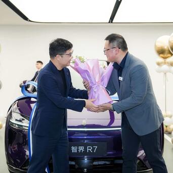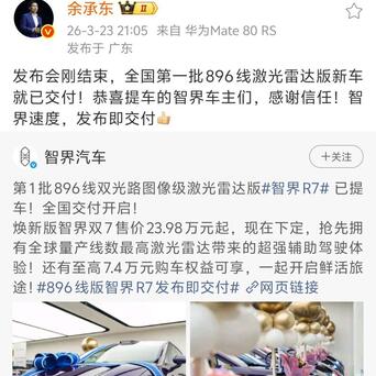 在智界官方微博的动态中,世界第一批896线双光路图像级激光雷达版智界R7提车现场额外吵杂欢快。