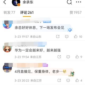 在余承东微博挑剔区,许多粉丝和网友纷纷留言叮咛余总真玉体魄,留意休息,并期待他主讲4月份的发布会与直播。