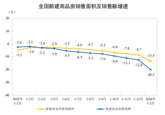 从销售情况看,1—2月份,新建商品房销售面积9293万普通米,同比下跌13.5%,降幅比上年全年扩大4.8个百分点;新建商品房销售额8186亿元,同比下跌20.2%,降幅扩大7.6个百分点。